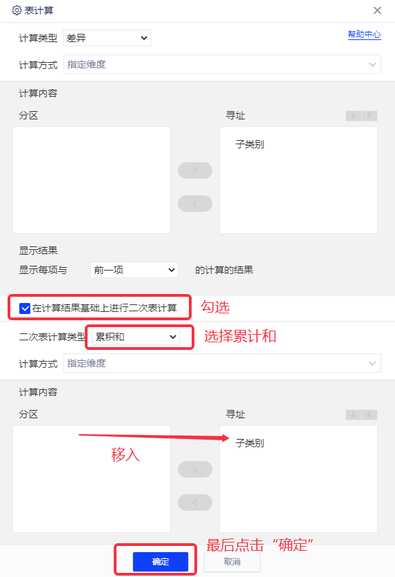 (6)勾选“在计算结果基础上进行二次表计算”,二次表计算类型选择“累积和”,将“子类别”放入寻址中,点击确定;