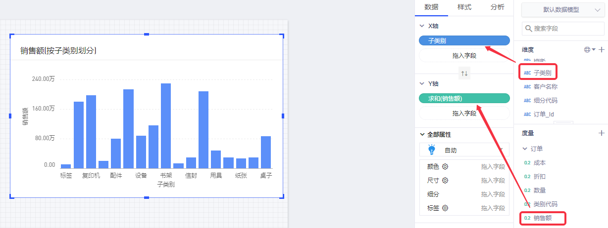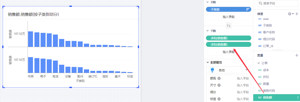 (2)将维度“子类别”放置在X轴,度量“销售额”放置在Y轴;