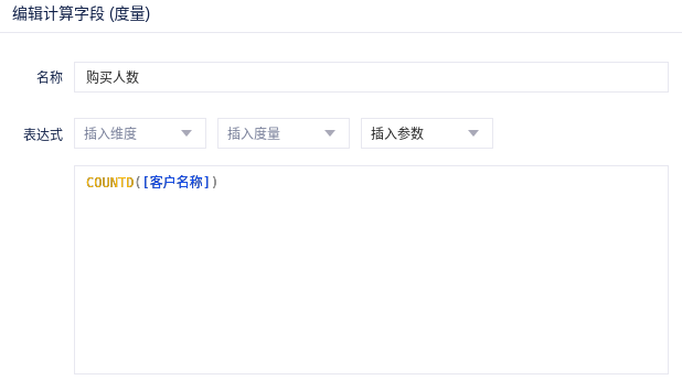 新建一个名称为“购买人数”的计算字段,把所有下单用户做一个计数统计,如下图所示: