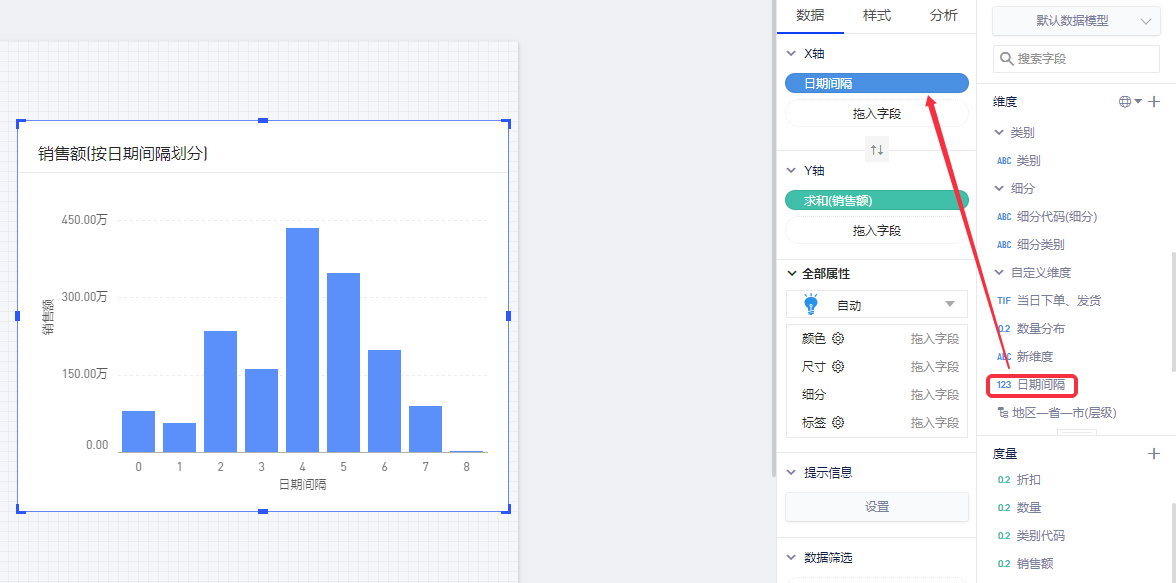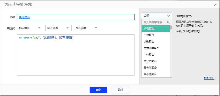 这时我们想计算“发货日期”及“订单日期”之间的间隔天数或间隔月份,可以在计算字段的表达式输入框中输入: