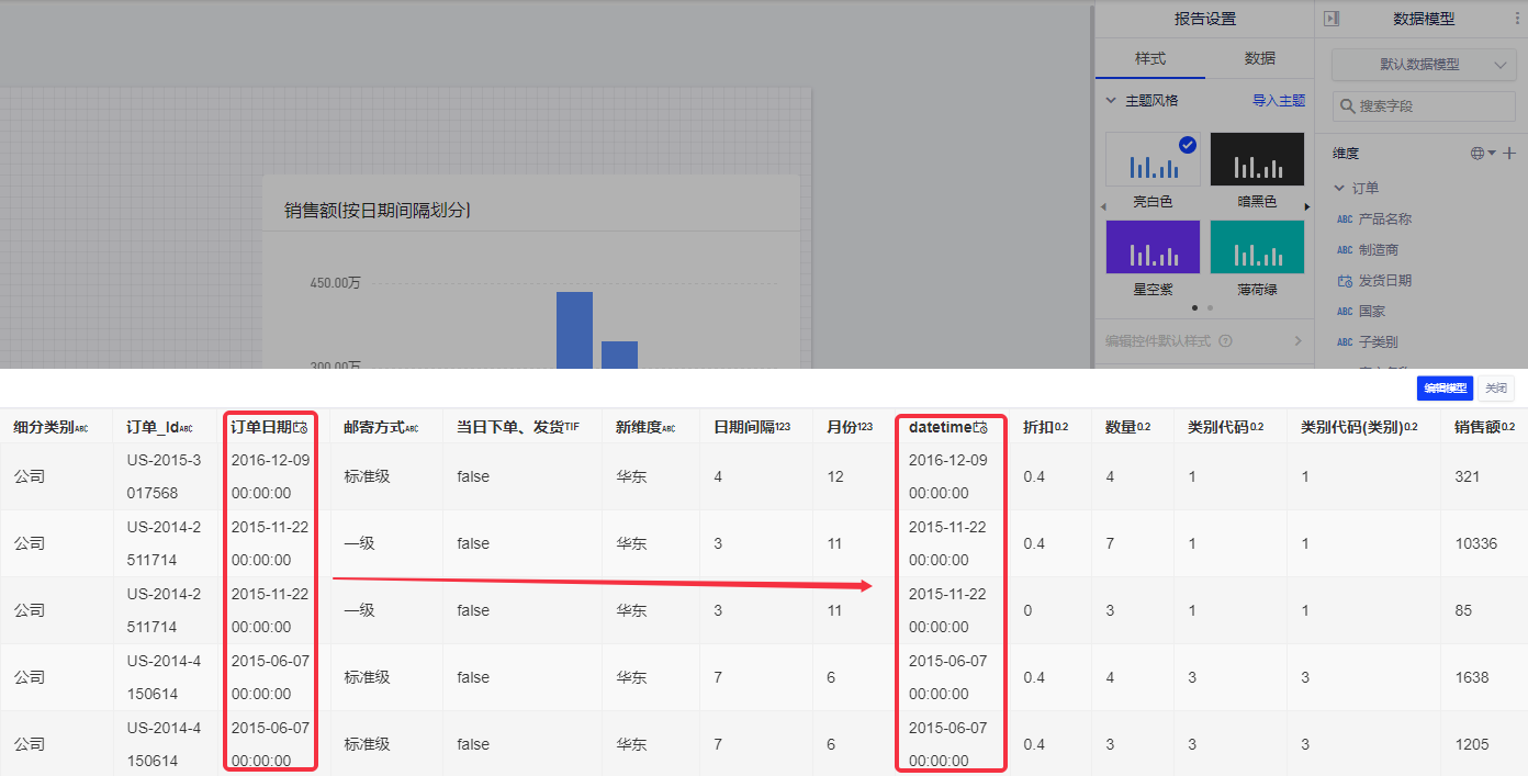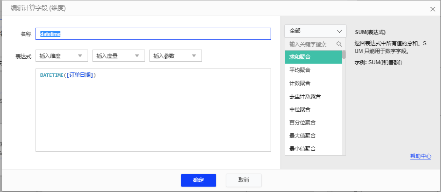 这时,我们想了解“订单日期”的年月日,并精确到秒信息,可以在计算字段的输入框中输入:DATETIME([订单日期])