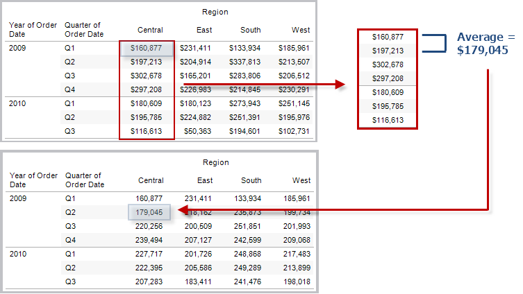 示例:WINDOW_AVG(SUM([Profit]), FIRST()+1, 0) along [Date],[Quarter]