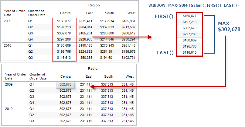 示例:WINDOW_MAX(SUM([Profit]), FIRST()+1, 0) along [Date],[Quarter]