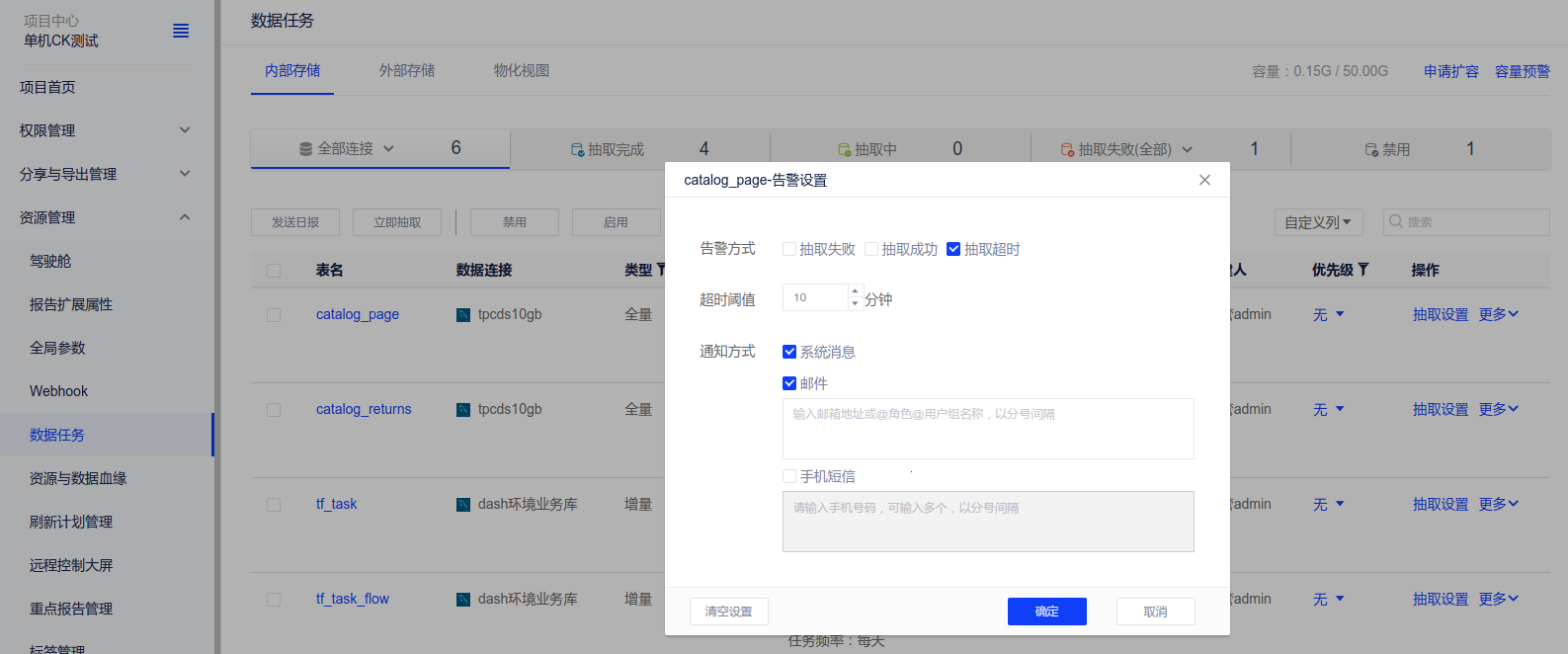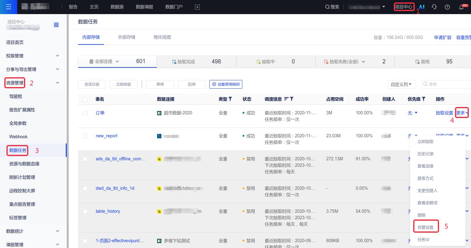 针对已配置过抽取的任务,在项目中心-资源管理-数据任务-更多-告警设置