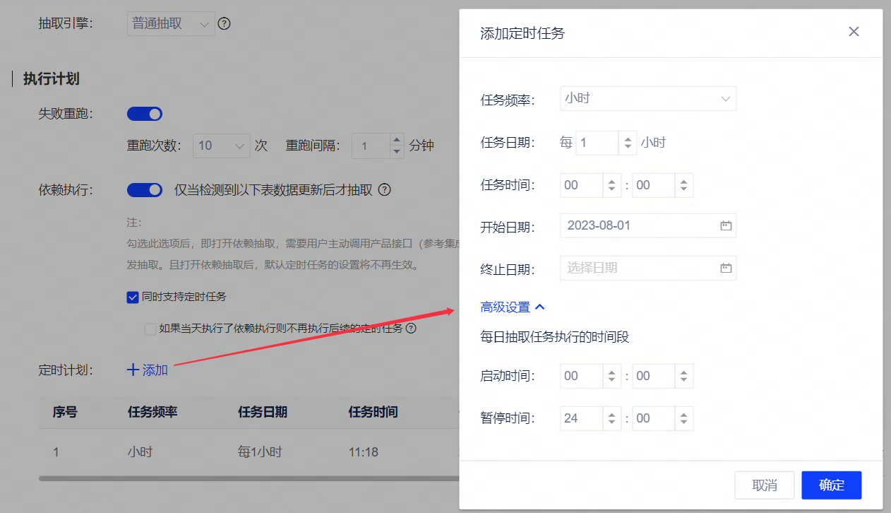 当任务频率为秒、分钟、小时时,可配置每日抽取任务执行的时间段。当定时任务到暂停时间后自动关闭,第二天到启动时间后会再次开启。