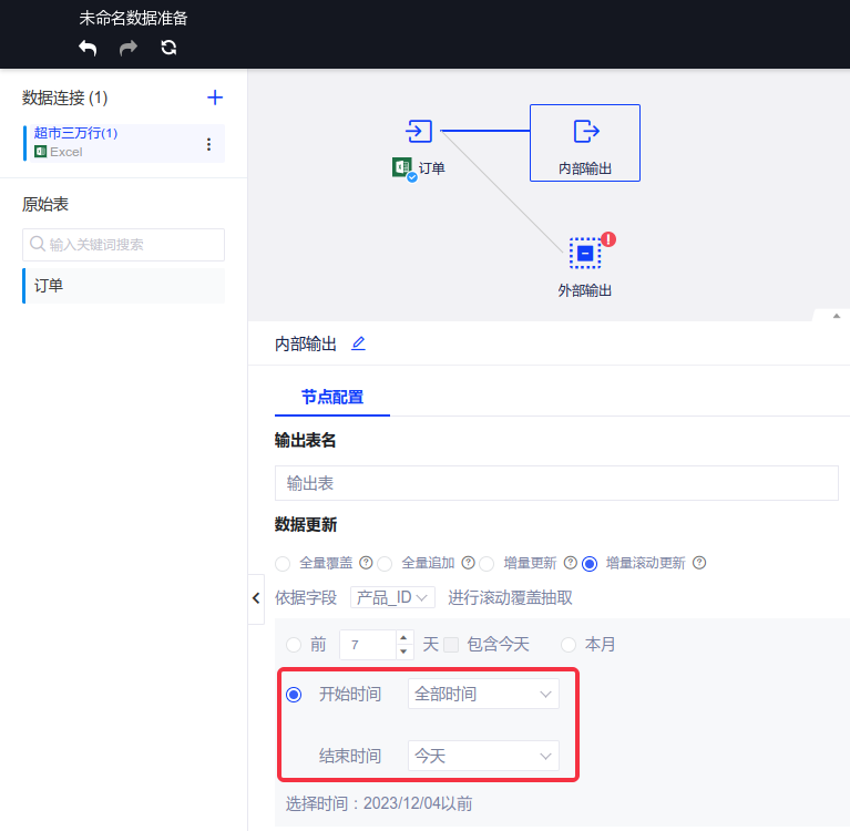 每次只抽取相比于上次更新增加的数据,提供了增量抽取和增量抽取(滚动覆盖)两种抽取方式