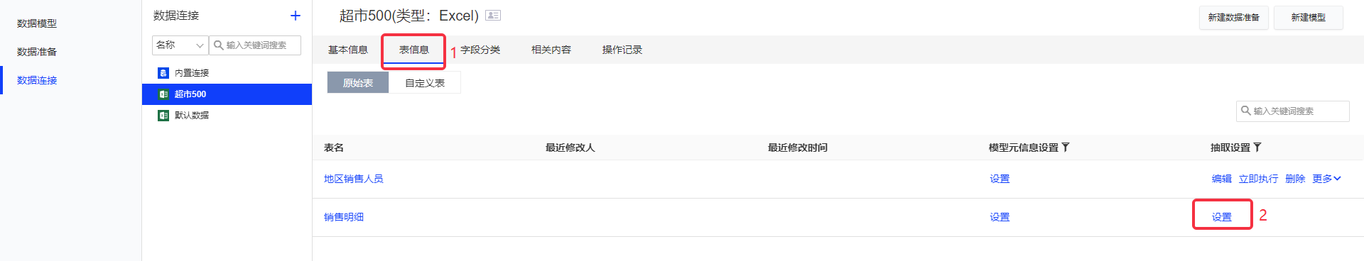 在数据连接中,您可以在选择需要设置的数据连接后,选择[表信息],列表中会显示该连接内所有的数据表,然后可对需要抽取的表进行抽取设置。