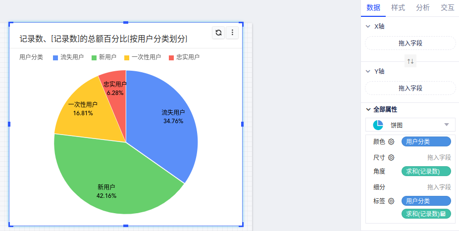 (2)图表类型改为“饼图”,将字段“用户分类”拖入「颜色」、「标签」栏,字段“记录数”拖入「角度」栏,并将「记录数」使用快速表计算为“总额百分比”,如下图所示: