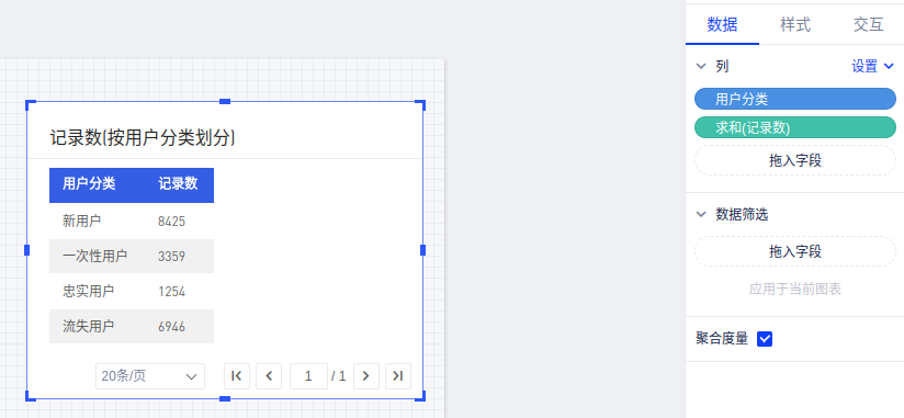 (3)选择“表格”控件,在画布上再添加一个“表格”,然后将字段“用户分类”和“记录数”拖入列,得到用户分类表;