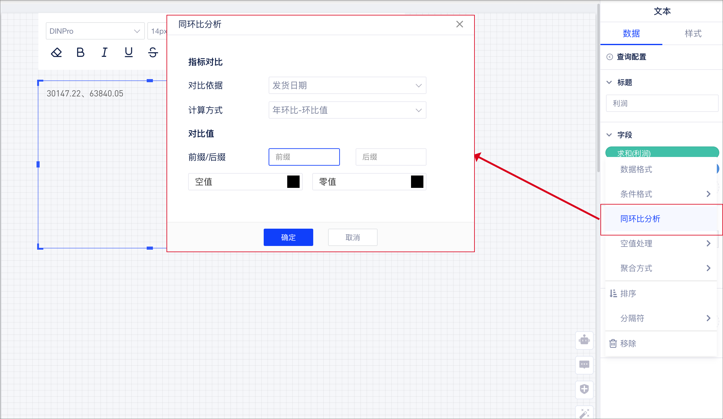 进入查询配置界面-选中字段-选择同环比分析-配置相关内容。
