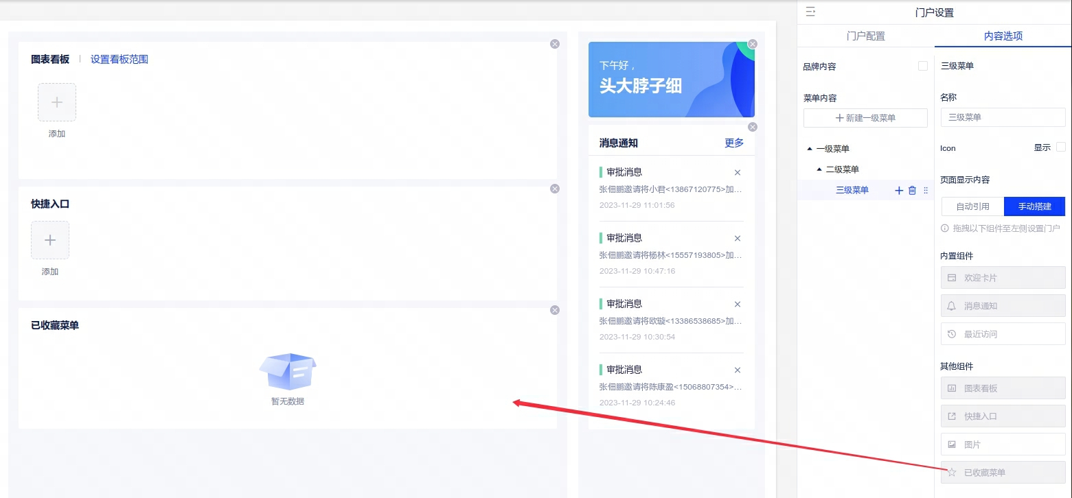 • 门户 - 内容选项 - 手动搭建面板 - 其他组件,新增【已收藏菜单】组件,通过拖拽方式添加到门户页面