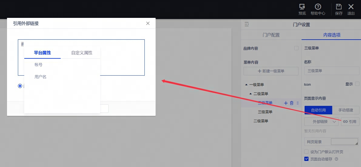 2、外部链接支持插入参数:门户引用外部链接时,支持引用平台属性和自定义属性