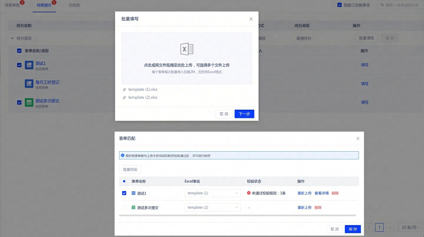 数据填报支持批量上传excel,适用于定期批量填报的业务场景(PS:一个待办任务中最多可上传50个且不大于2MB的excel文件)