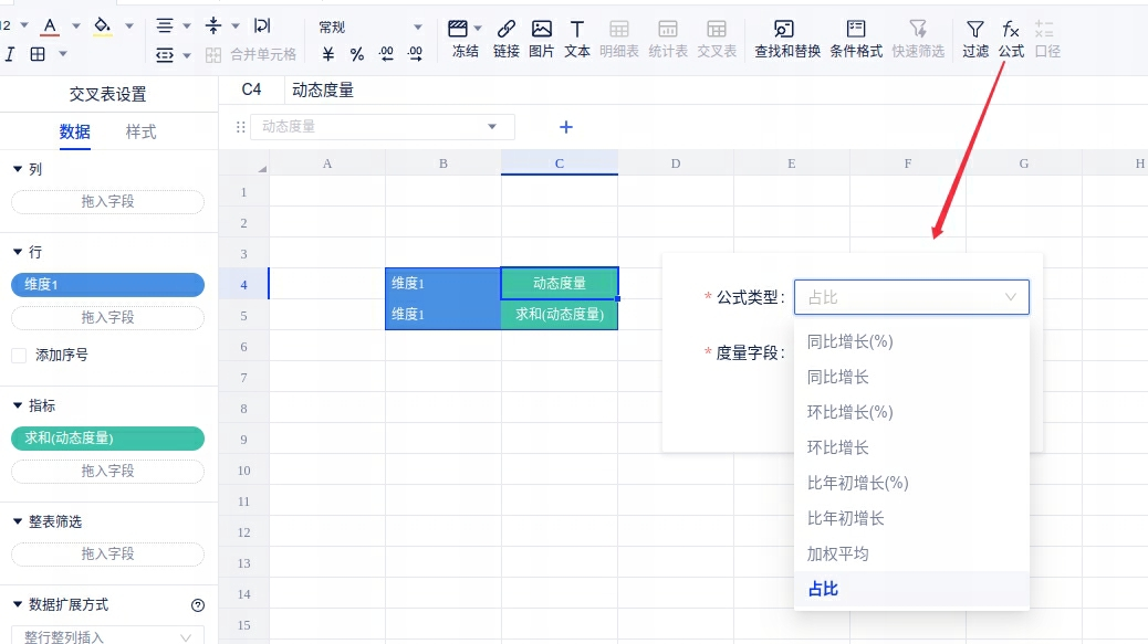 1、顶部工具栏:公式栏增加”占比“,提高公式和数据配置效率。