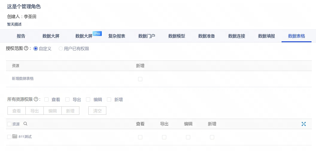 3、角色管理:管理角色增加数据表格模块,拥有管理角色的用户可授权数据表格的权限