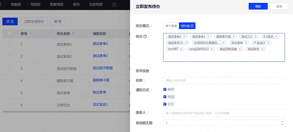 在[项目中心]-[填报管理]-[定时/非定时待办]中创建一个待办任务,待办模式需选择“待办组”,最多可选择50个需要接收人一次性提交的表单;