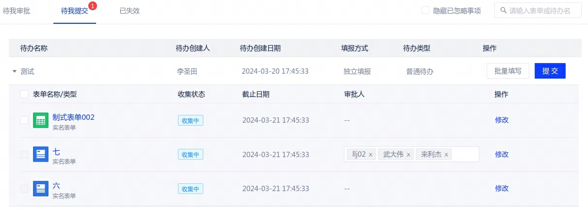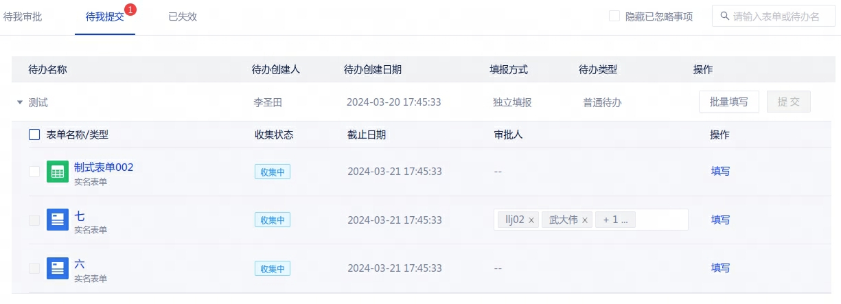 待办发布后,接收人在[待我提交]页面中可针对当前待办选择批量填写或逐个填写;
