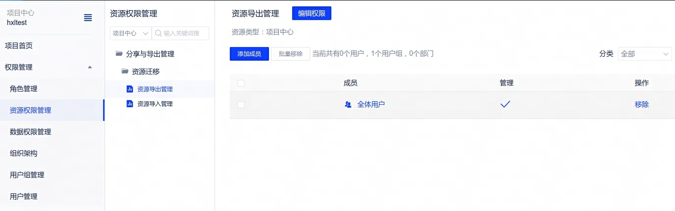 1、资源权限:新增”项目中心“权限,拥有该权限的普通用户可在项目中心进行资源导入导出管理