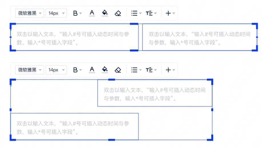1、控件:文本框组合时编辑弹窗优化。文本框与其他组件多选时不显示文本编辑栏;文本框与文本框多选时显示文本编辑栏,编辑栏位置位于所有文本框的左上角(插入链接置灰不支持)。