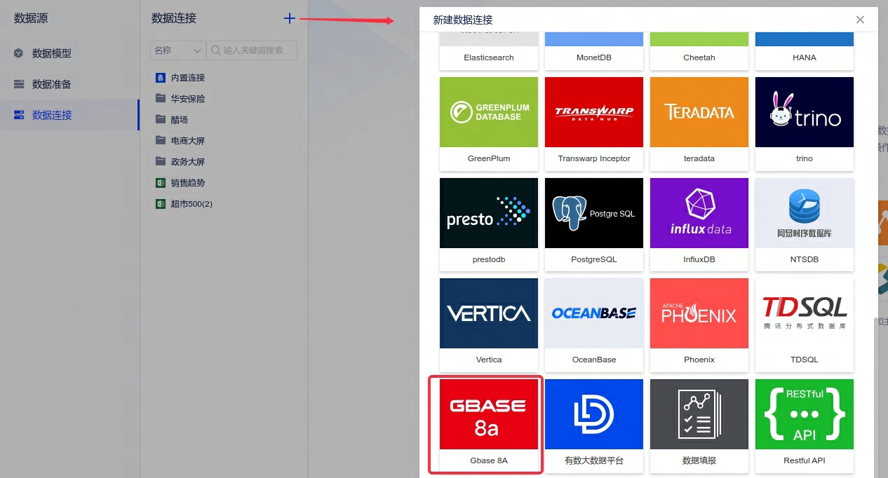 1、【数据连接】数据源适配Gbase 8A,您可以在[数据源]-[数据连接]-[新建数据连接]中找到它的配置入口。
