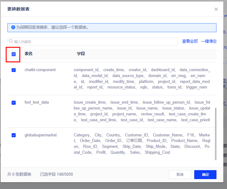 4、【新增】进行更换数据表时,在[已选数据表]中点击复选框,可以将选中的数据表批量取消选中。