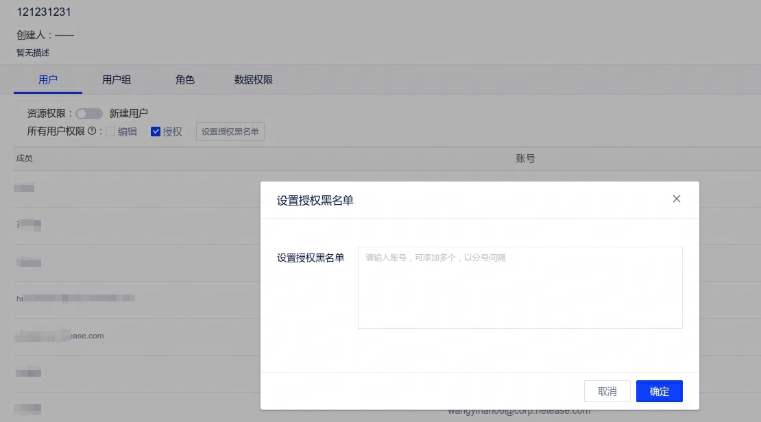 【新增】管理角色配置授权对象时,若勾选所有用户,则支持黑名单配置,意为不可对黑名单中的用户操作授权,细化授权权限管控
