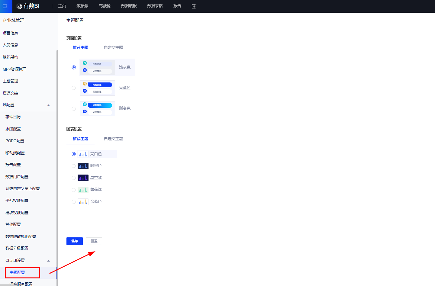 8、【优化】问答界面样式及图表颜色支持自定义,在企业域管理ChatBI设置中支持页面样式的配置,用户可以选择推荐主题或自定义样式。