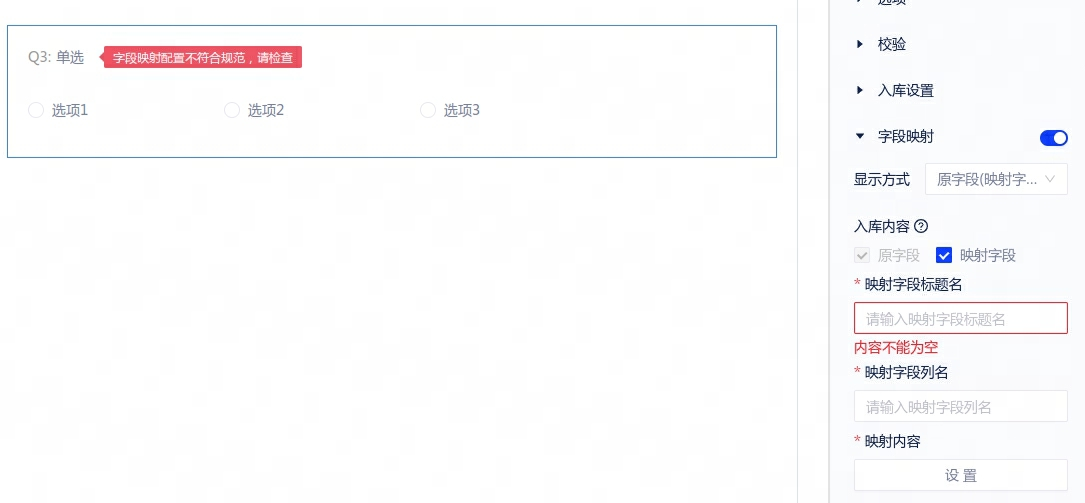 1、【新增】流式&制式表单映射字段支持入库内容配置。对于单选和多选组件,配置映射字段启用时,增加内容配置。入库内容不勾选映射字段,则其标题名、列名不需要设置,数据管理模式下同步表单显示的内容。