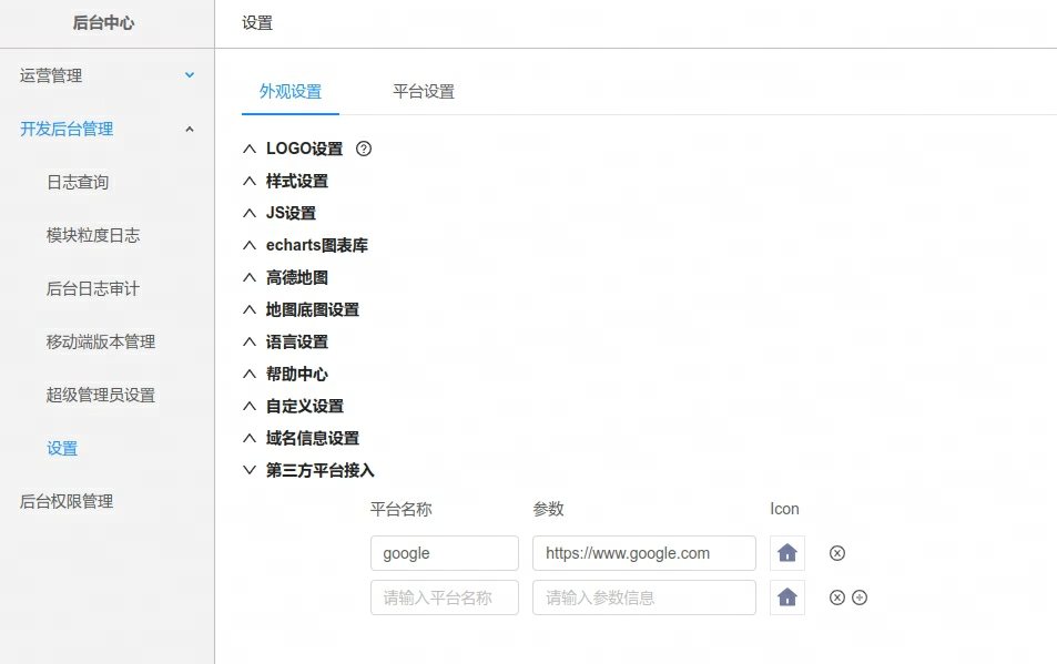 支持配置第三方平台帐号接入,用户可从产品导航栏免密跳转登录至第三方平台。需在开发后台管理中设置,下图仅为示例