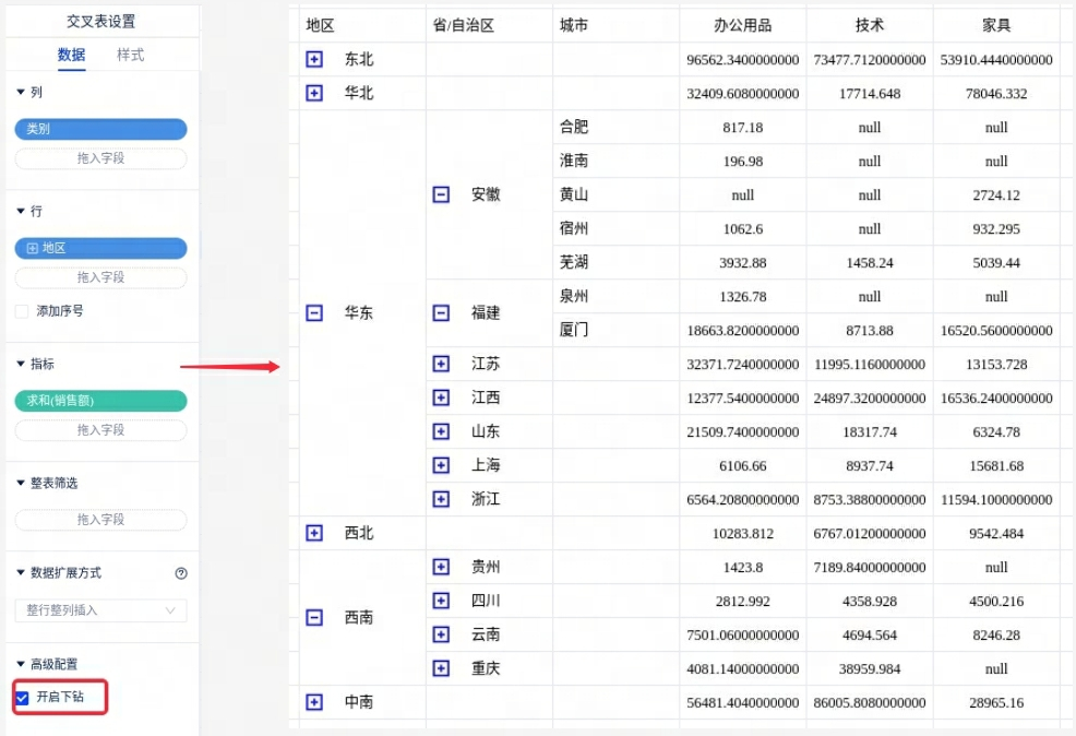3、【优化】聚合表格交叉表支持对层级字段上卷下钻