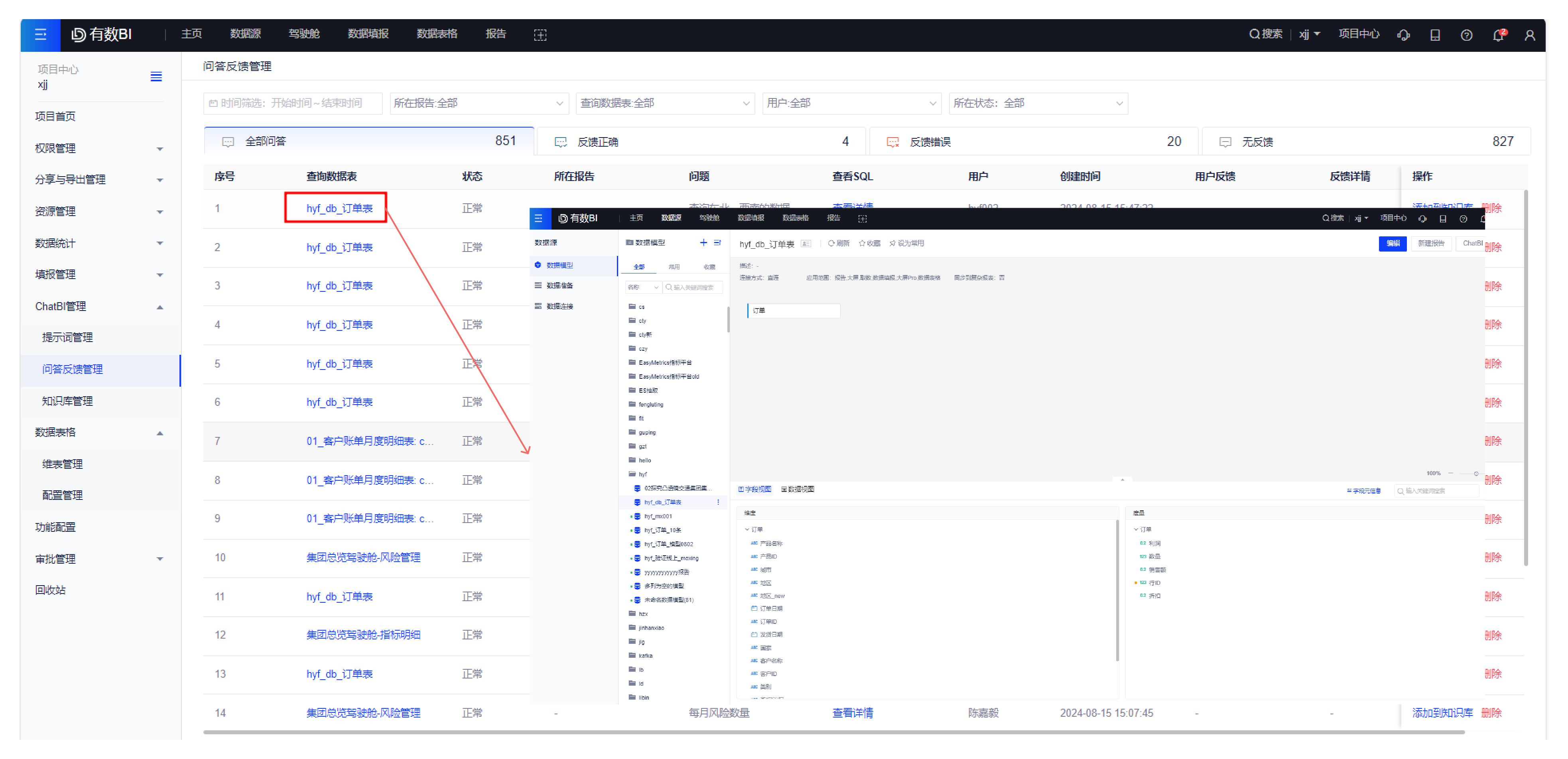 2、【新增】知识库、问答反馈反馈管理点击数据表可以跳转到数据模型