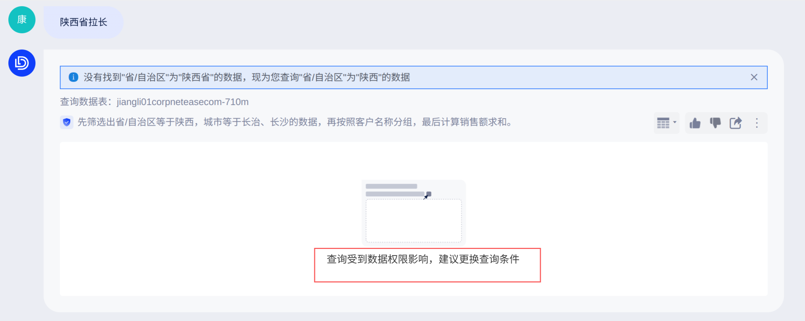 5、【新增】有数据但是无权限情况下,查询将提示:“查询受到数据权限影响,建议更换查询条件”