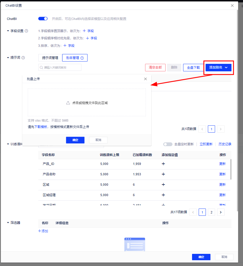 3、【新增】提示词别名支持批量上传,用户可以在添加别名界面选择“批量上传”,按照提供的模板格式,上传包含别名映射关系的xlsx文件。
