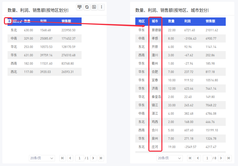 层级字段支持上卷下钻向右展开下级字段。
