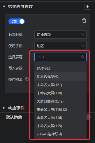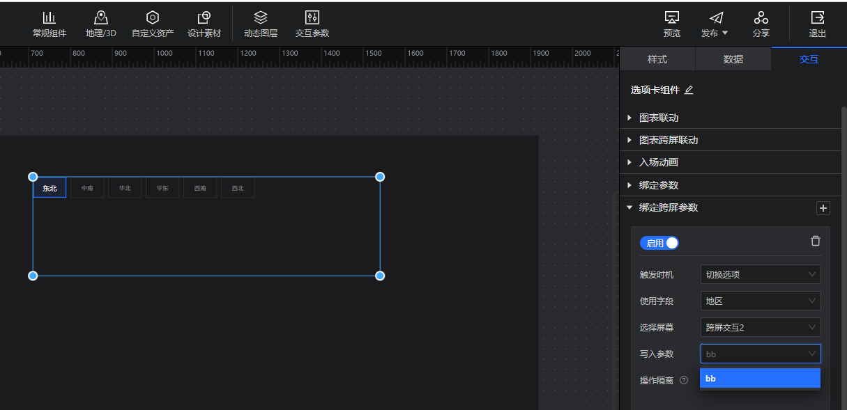 如下图所示,组件的“交互”模块里增加了“绑定跨屏参数”设置,可选择将字段值传递至其他大屏的交互参数;