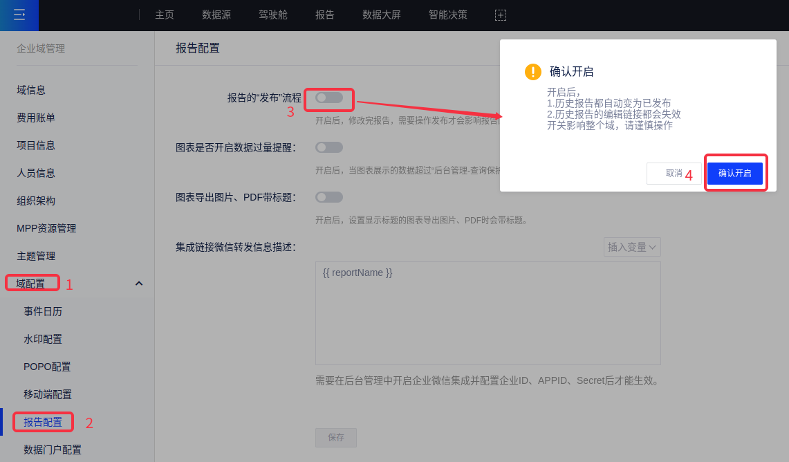 该功能默认为关闭状态,您可在[企业域管理]中开启报告发布功能,如下图所示: