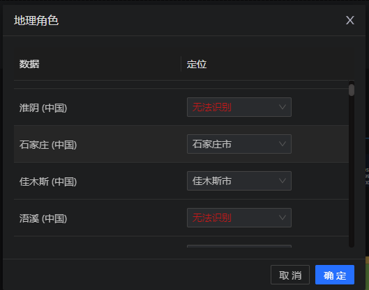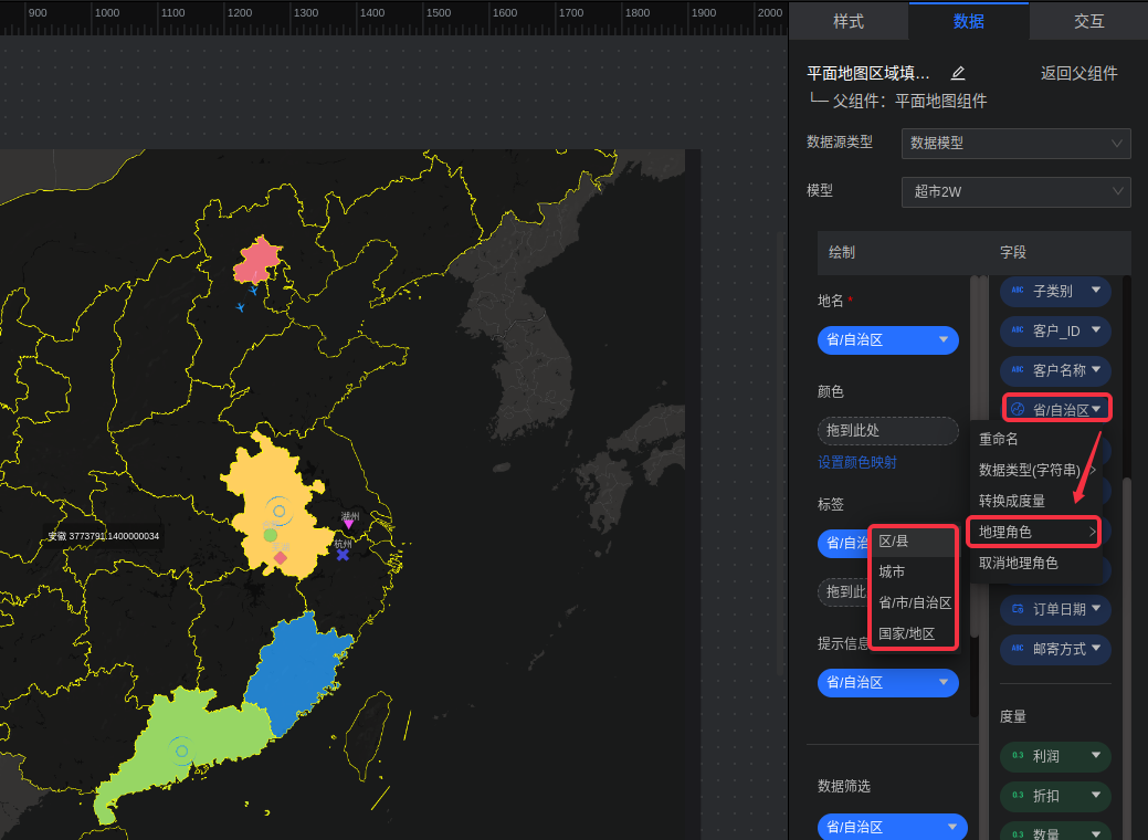 针对维度字段,可设置地理角色。支持设置成4个粒度的地理角色:“国家/地区”、“省/市/自治区”、“城市”、“区县”