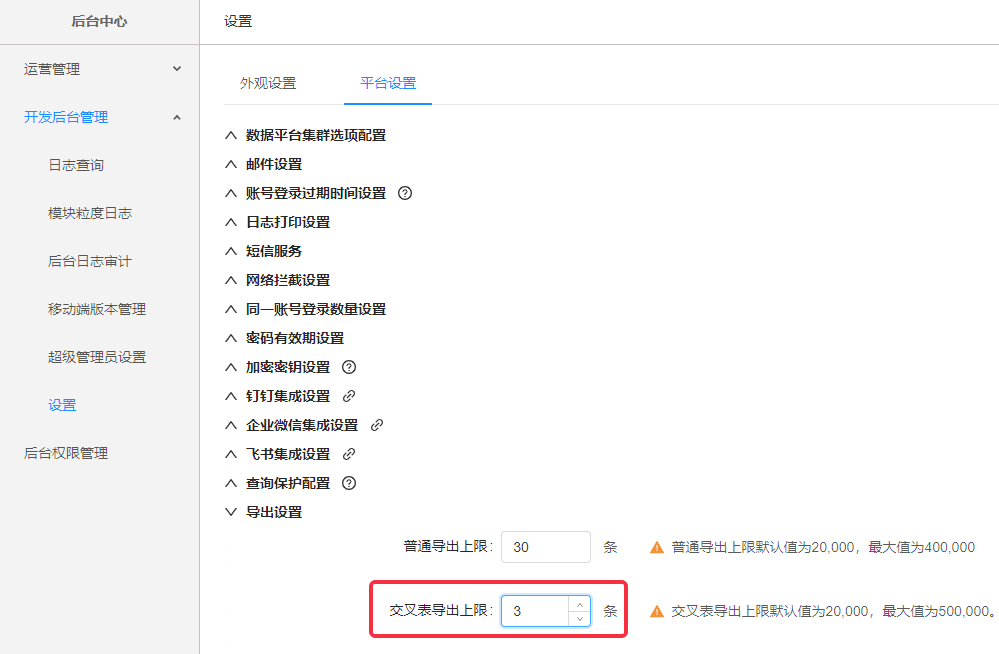 默认最多导出50000行数据,可至“后台管理-设置-平台管理-导出设置”设置导出上限(该设置适用于私有化部署版本,SaaS版本不支持)。