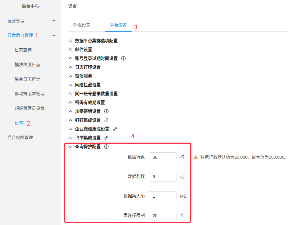 新增报告查询保护配置,支持设置数据行数、列数以及数据集大小展示上限(该设置适用于私有化部署版本,SaaS版本不支持)。