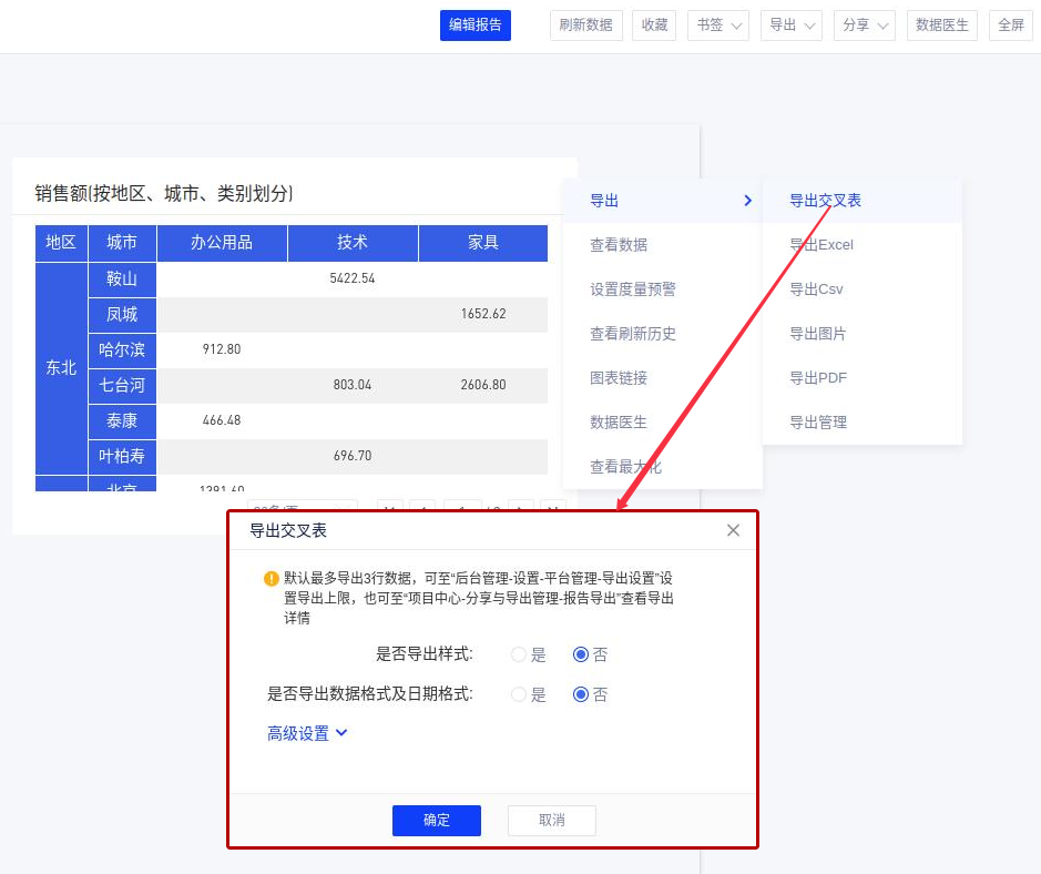 导出交叉表增加导出交叉表数据量上限提示。