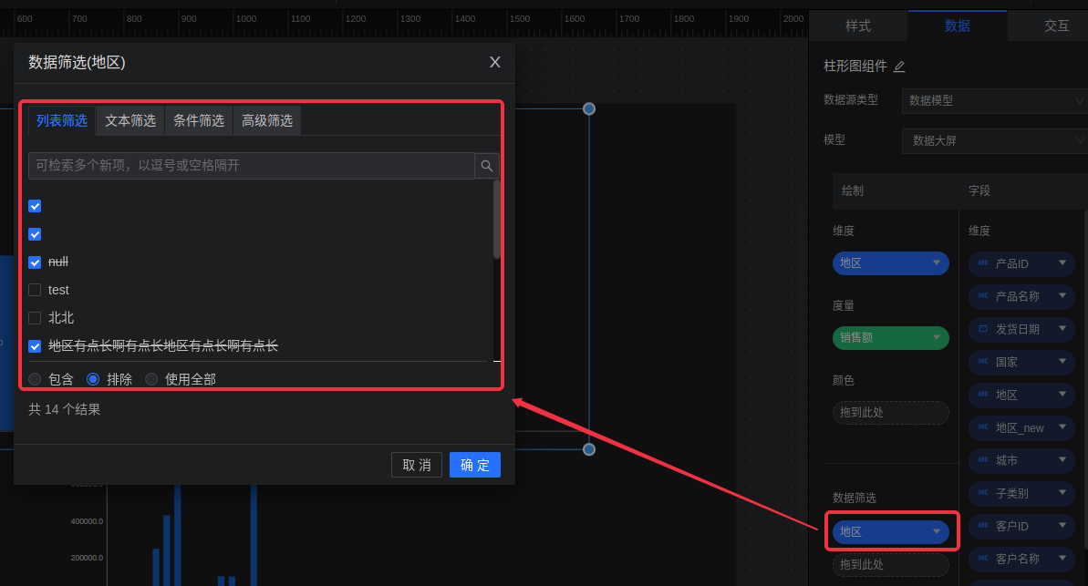 维度字段(字符串、整数、小数类型)的支持列表筛选、文本筛选、条件筛选和高级筛选(TopN)