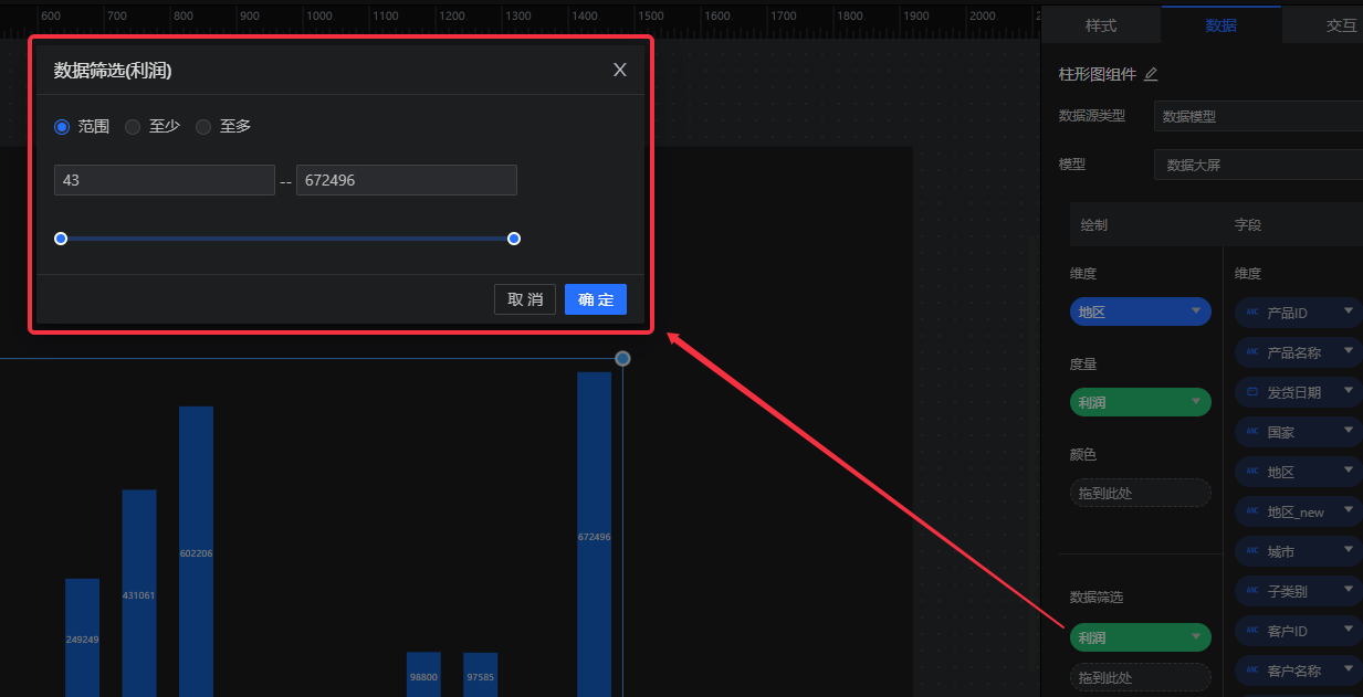 度量字段支持范围筛选(有范围、至少、至多3种筛选方式)