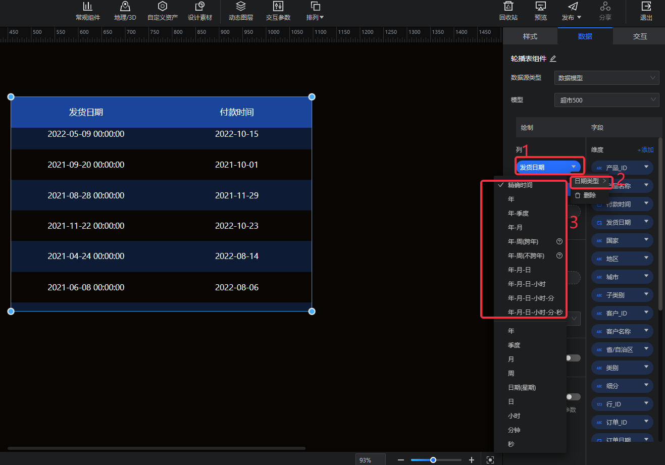 组件构建数据模型时,拖入日期字段,可设置日期类型,选择日期格式