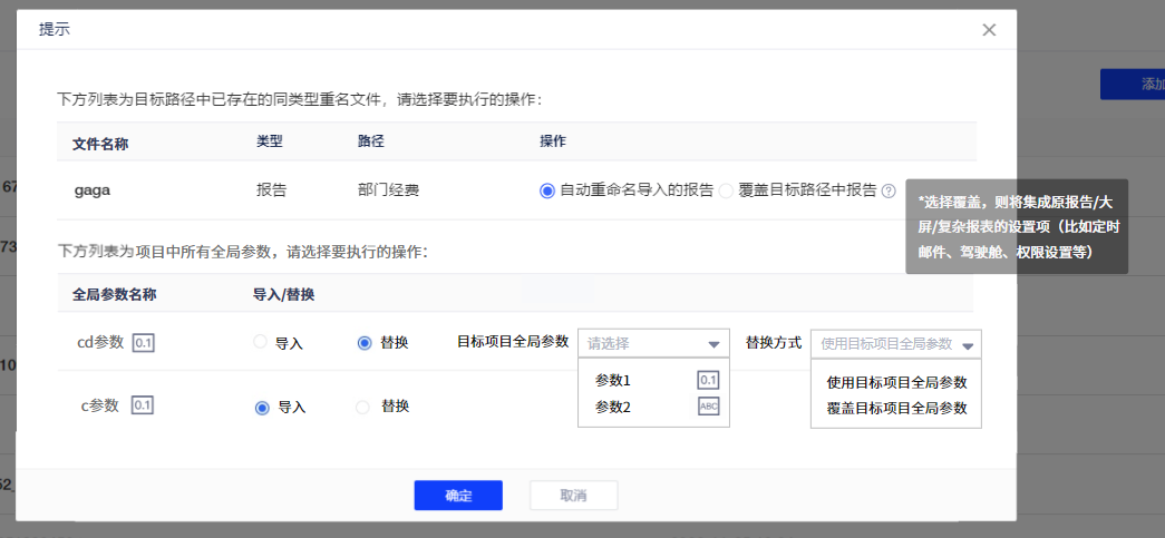在资源导入时,弹窗显示所有当前资源全局参数。可对其进行以下操作:全局参数支持设置替换,替换方法包括“使用目标项目全局参数”或“覆盖目标项目全局参数”