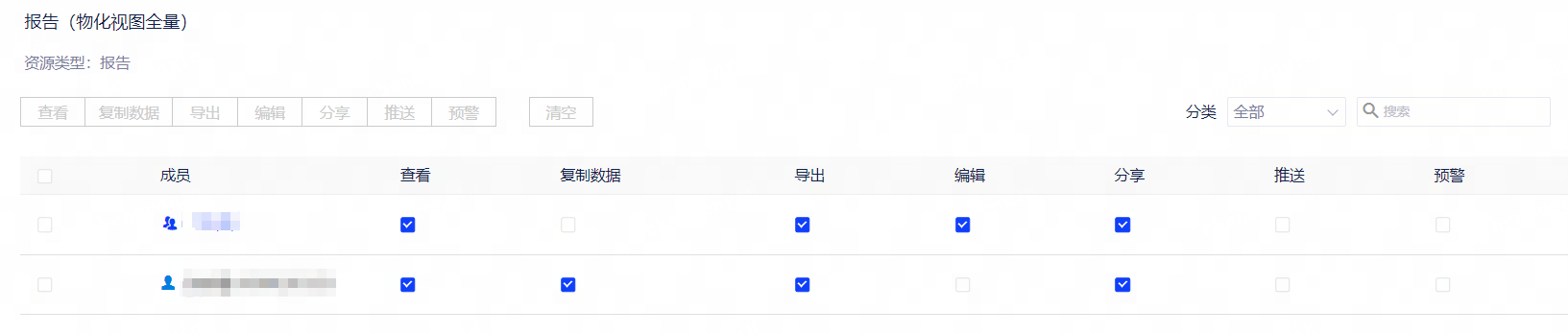 • 原数据权限管理-资源tab下的报告旁新增了【数据填报】tab