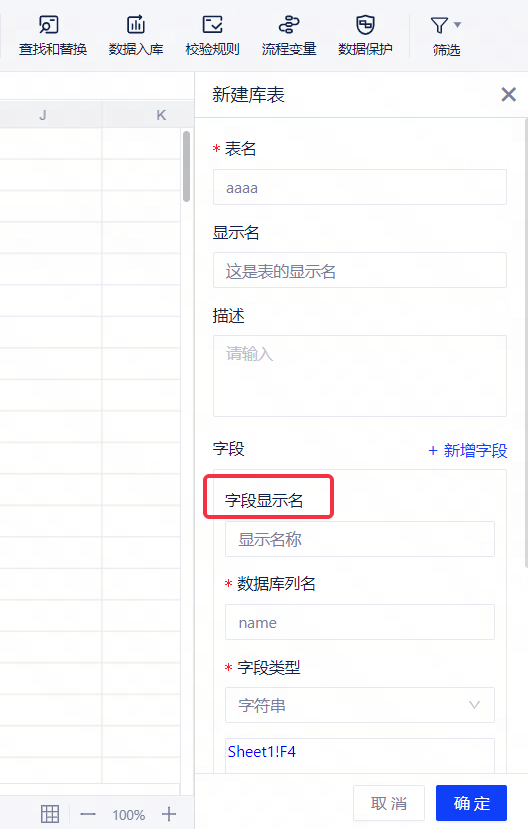 • 制式表单在设置数据入库时,字段新增显示名设置选项,作为数据模式中的列名称