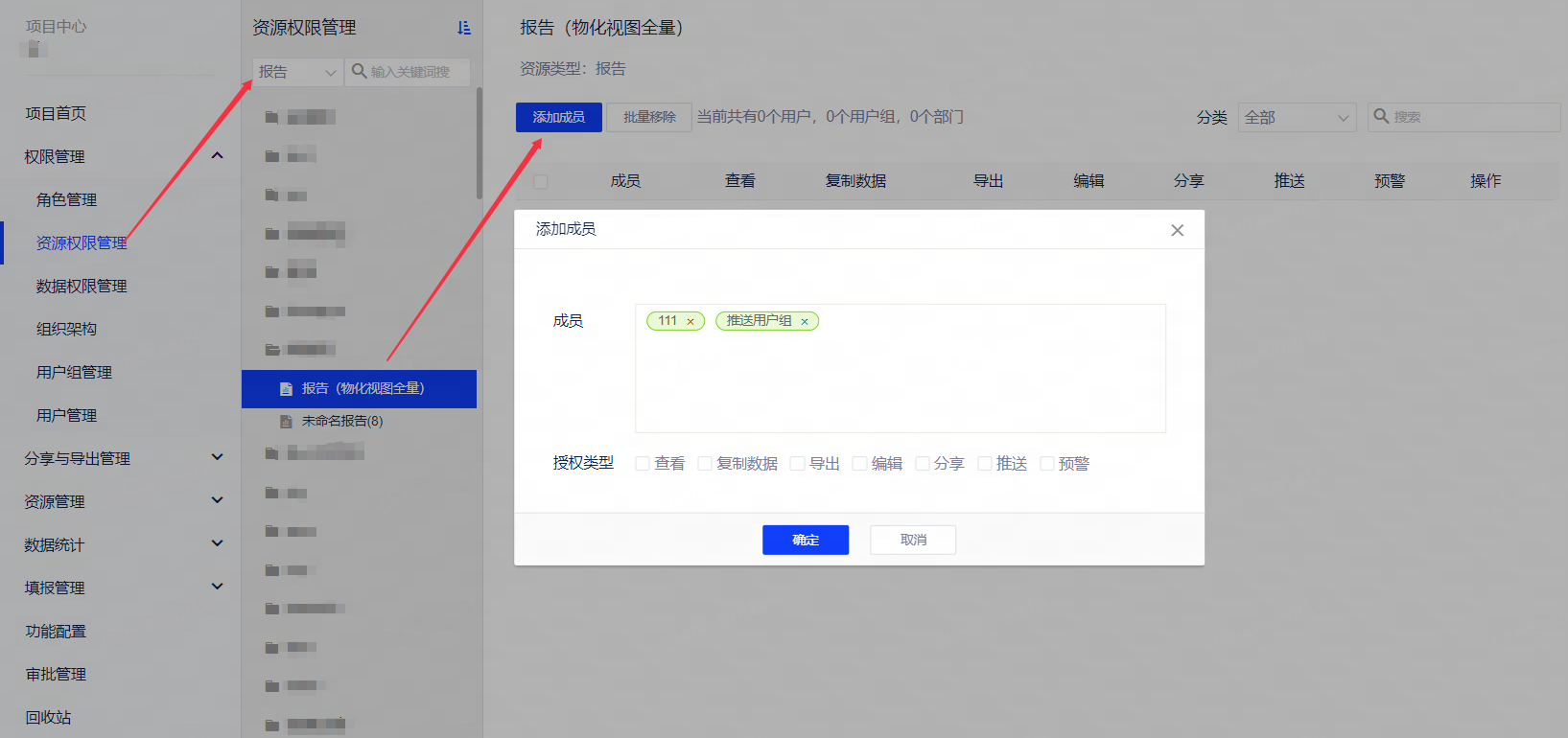 新增了“资源权限管理”功能菜单,资源类型默认选中报告,下拉可切换