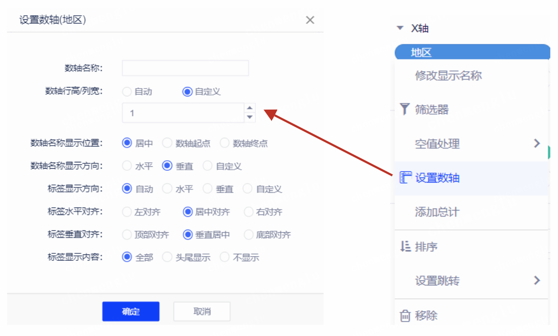 您可以在图表 - 数轴维度字段 - 设置数轴界面,选择数轴行高/列宽自动或者自定义设置: