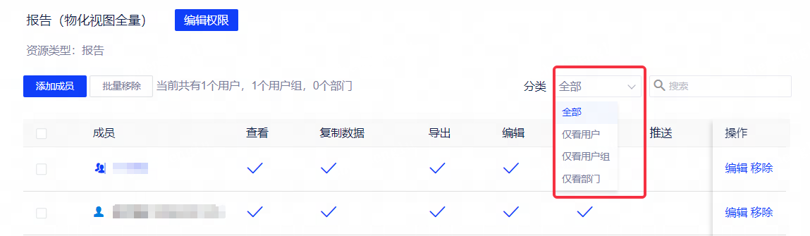 点击“编辑权限”可批量修改已授权用户/用户组/部门的资源权限
