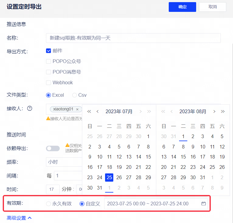 • 定时导出:您可以在自助取数 - 公众查询 - 设置定时导出界面中,设置有效期,默认为永久有效,选择自定义后,支持配置【开始日】与【到期日】,选框内默认选择为当天~一个月。